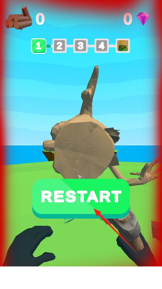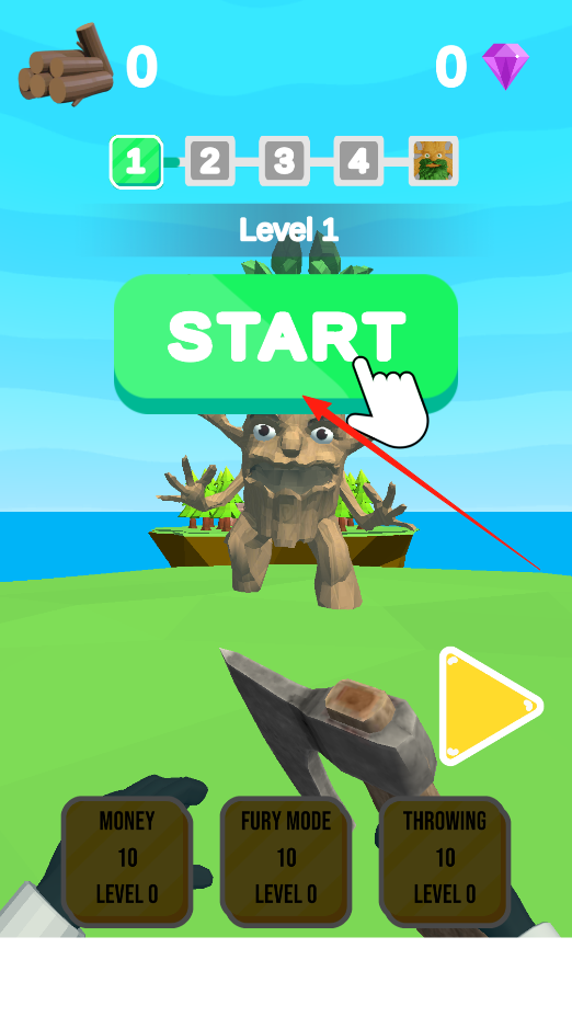 1、在剁碎他们初始界面,点击START按钮,开启第一关挑战,通过此操作,进入伐木场景,使用斧头砍伐树怪,推进关卡进程,体验战斗伐木玩法。