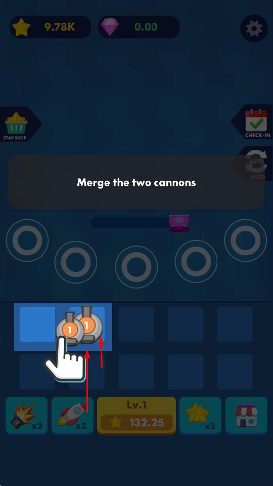 2、在拥有多个加农炮后,根据提示将两个相同等级的加农炮合并,升级为更高级的加农炮,增强攻击效果。