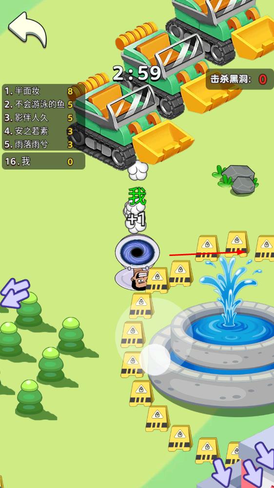 2、游戏过程中,警惕周围更大的黑洞,利用移动技巧躲避袭击,同时收集装备道具,借助加速、加血等效果,在众多黑洞的对决中占据优势。