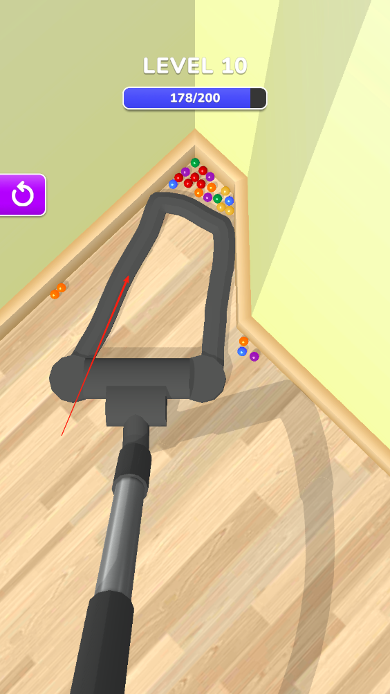 1、根据前方墙角,绘制一个如图所示的扫帚,最上方会显示这一个关卡需要收拾多少个小球,收集满才能结束游戏。