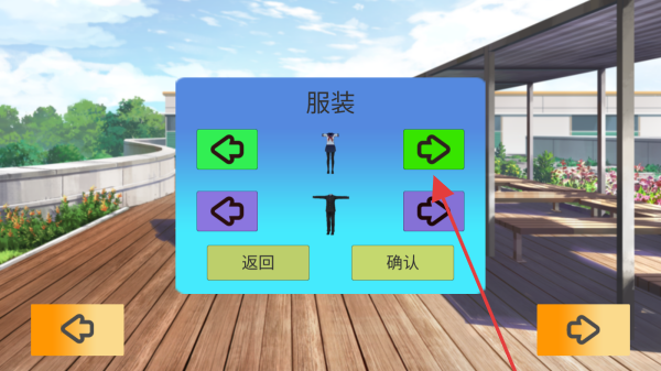 2、完成性别选择后,进入服装选择界面,通过点击绿色和紫色的箭头按钮,挑选自己喜欢的服装款式,选好后点击确认按钮。