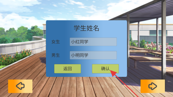 3、最后进入学生姓名设置界面,女生默认姓名为小红同学,男生默认姓名为小明同学,确认无误后点击确认按钮,即可完成初始设置。