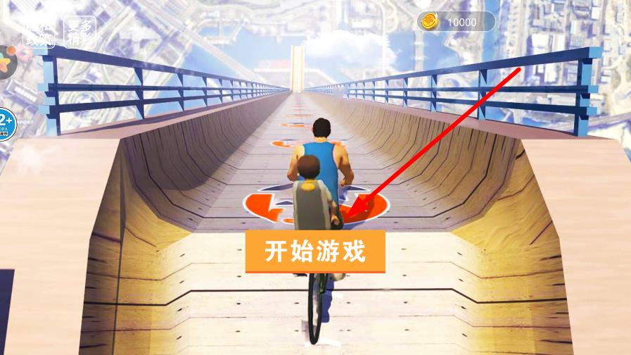 1、在游戏初始界面,点击“开始游戏”按钮,选定骑行角色与初始赛道,进入高空坡道场景,准备开启骑行挑战。