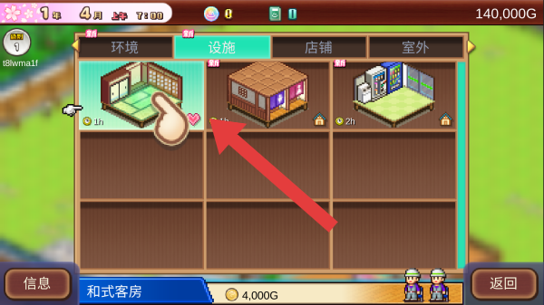 1、画面显示设施建造界面,玩家可选择建造如和式客房等设施,下方显示和式客房售价为4000G。