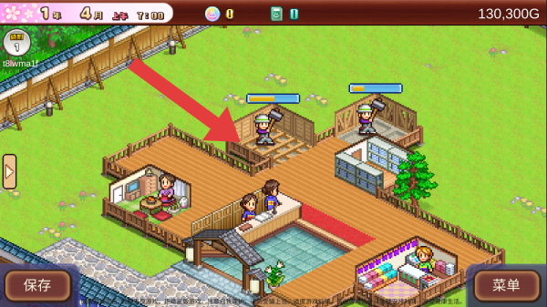 2、展示了温泉度假酒店的建造经营场景,红色箭头所指位置是提示关注工人或建筑相关操作,画面中有客人、工人、温泉设施等元素。