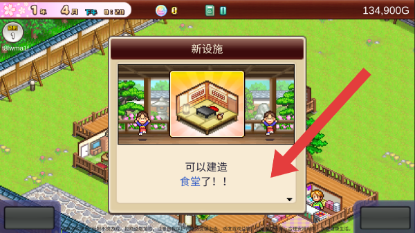 3、显示新设施提示,告知玩家可以建造食堂了,呈现的是游戏中解锁新建筑设施的界面。