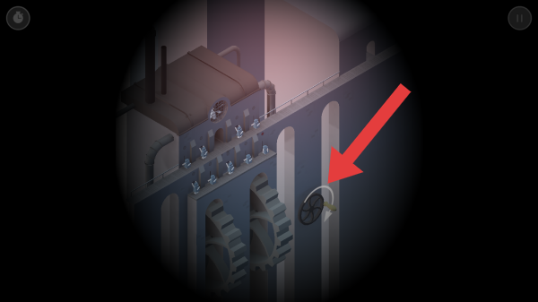 1、画面呈现的是含机械、建筑元素的解谜场景,需要根据提示转动方向盘,再进行进一步的操作。