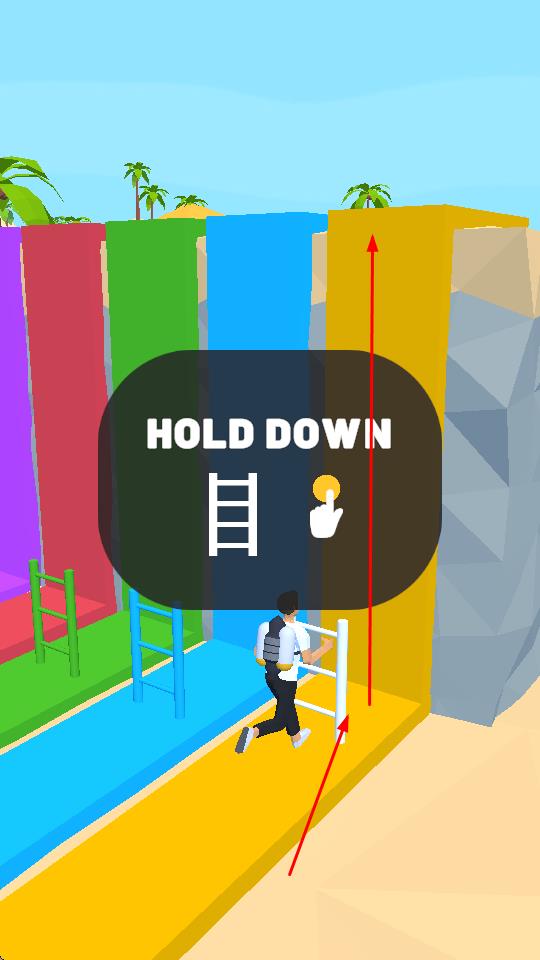 1、操控角色在彩色的赛道上移动,根据提示HOLDDOWN,按住屏幕让角色使用梯子或喷射装置,提升移动能力。
