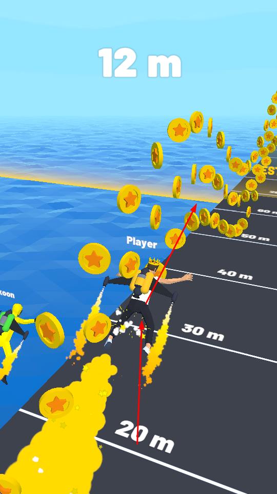 3、角色会进入不同的场景,如海边赛道等,继续收集金币,利用喷射装置等道具提升移动速度,完成关卡挑战,推进游戏进程。