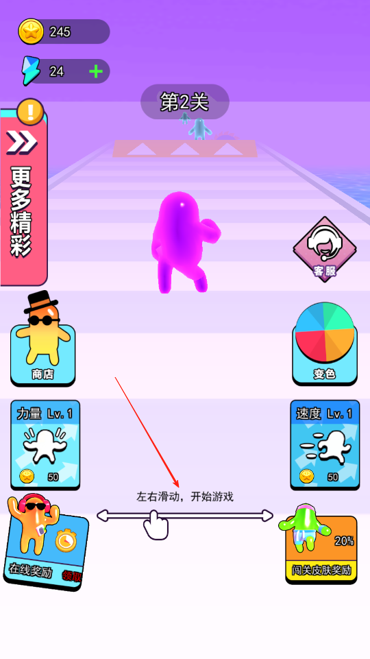 1、根据箭头提示左右滑动,开始游戏,操纵软糖超人在赛道上移动,收集软糖,让超人壮大起来。