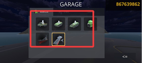 1、先在“GARAGE”里面选择合适的武器装备和你想要进行战斗的军事武器。