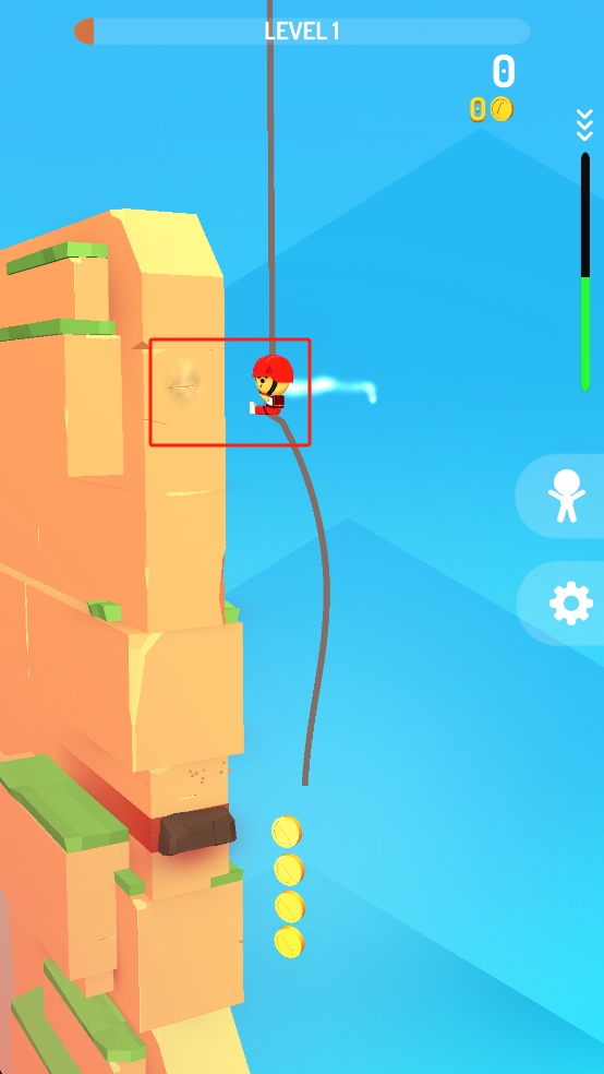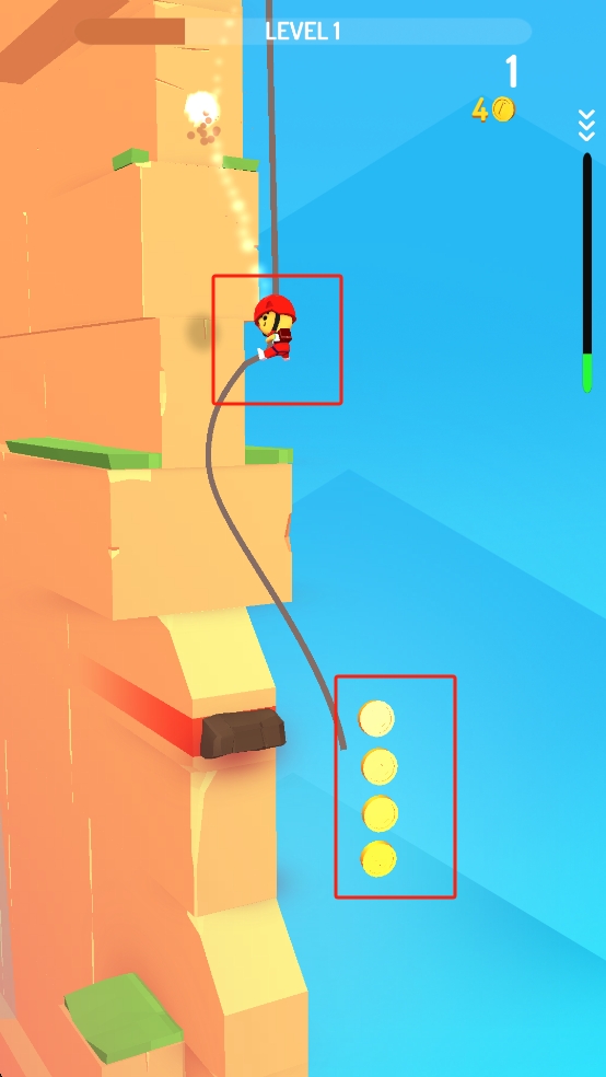 1、操控红头盔角色借吊绳摆动,触碰岩壁借力,顺路收集身旁金币,规划摆动轨迹向下攀爬。