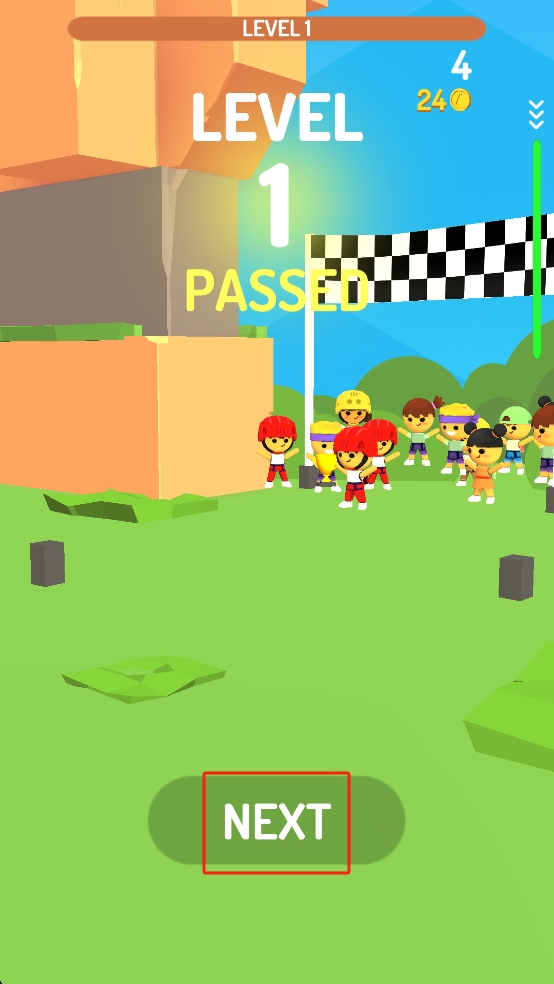 3、抵达终点后,点击红色方框内的NEXT按钮,进入下一关,挑战更复杂的攀爬与金币收集任务。