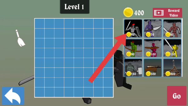 2、显示为第1关,画面右侧是不同兵种及对应价格,上方显示有400金币,玩家可能在此选择兵种来布置战斗阵容。