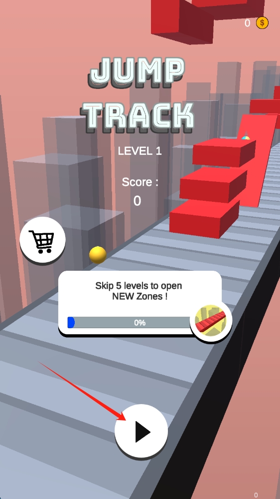 1、在Jump-Track的LEVEL-1启动界面,点击播放按钮,开启跳跃挑战,进入游戏世界,点击开始游戏。