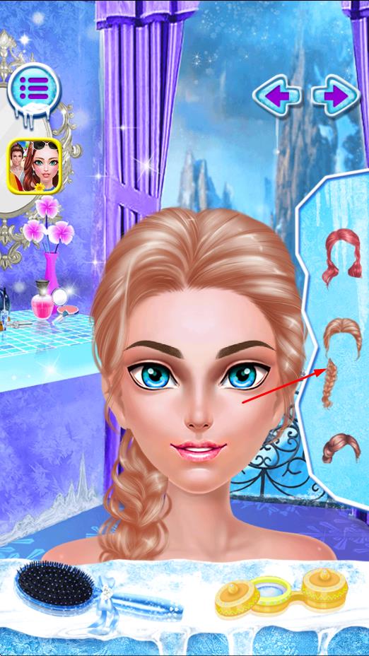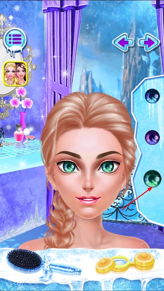1、进入游戏后选择爱莎公主形象,查看美妆道具栏与服饰选项,点击化妆品为公主进行基础的底妆修饰,完成首次妆容尝试。