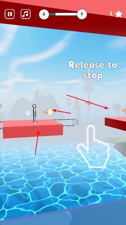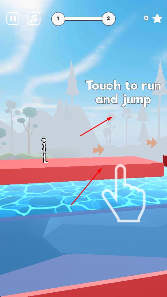 1、操控白色小人在红色平台上移动,触摸屏幕让小人奔跑和跳跃,越过蓝色的水域障碍。