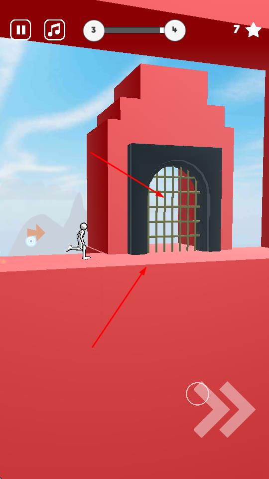 3、释放屏幕让小人停止移动,避开障碍物,朝着带有铁门的红色建筑前进,完成关卡挑战,推进游戏进程。