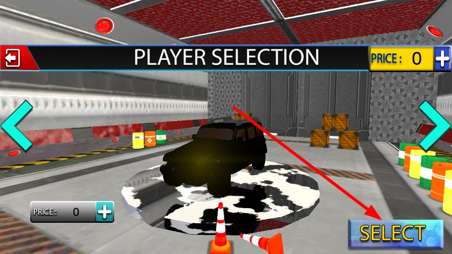 1、进入选车界面,点击“SELECT”选定车辆,确认后进入赛道,依据界面按钮与路障布局,开启停车挑战,熟悉车辆操控逻辑。