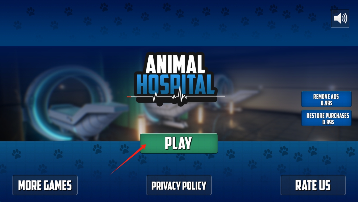 1、在Animal-Hospital启动界面,点击PLAY,开启宠物医院冒险,进入游戏世界,点击按钮进入游戏。