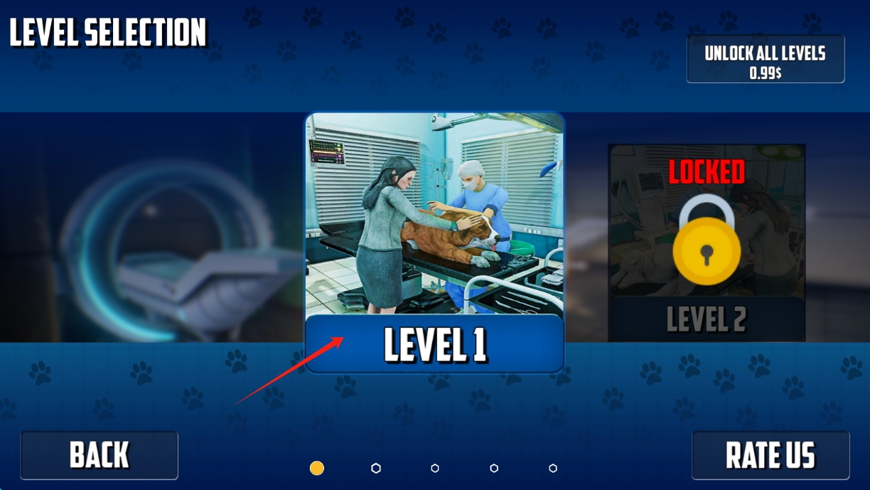 2、关卡选择界面,点击LEVEL-1,进入第一关,开始宠物诊疗任务,熟悉游戏玩法,点击选择关卡。