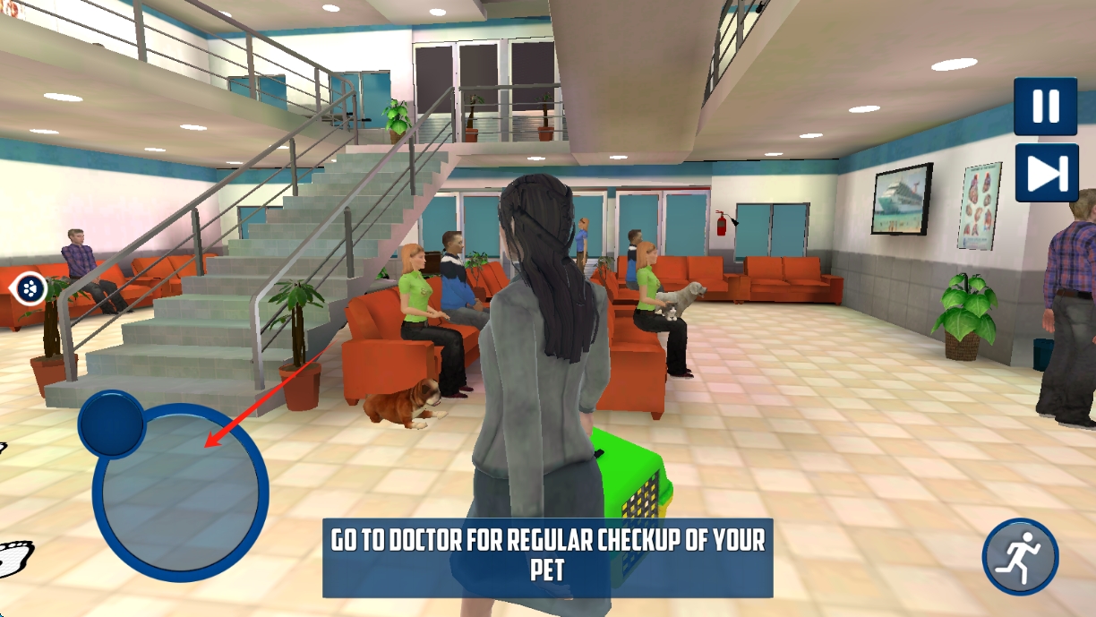 3、在医院场景,跟随提示,前往医生处,为宠物进行常规检查,完成任务,推进游戏进度,拨动轮盘移动。