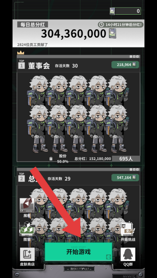 1、点击开始游戏按钮可进入场景,界面显示每日总分红、存活天数、股份等信息,还有董事会等小组人员展示。