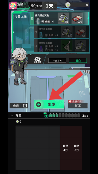 2、可点击出发进行第一天的任务,任务提交后奖励为业绩+1,可看出是带有任务、养成、探索等元素。