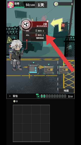 3、呈现2级电力回收站,有体力-1、辐射值涨等效果,玩家业绩50/100,存活天数1天,属于带有养成、探索及资源交互的界面。