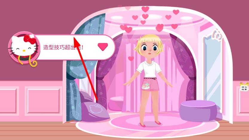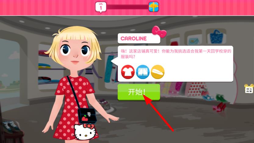 1、进入游戏后,在凯蒂猫主题的服装店内熟悉各类服饰分区,包括上衣、裙子、配饰等,等待第一位顾客进店咨询。