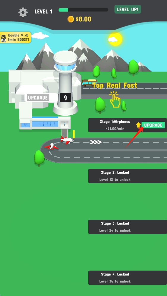 1、在LEVEL-1机场经营场景,点击UPGRADE,消耗资源,升级第一阶段飞机,点击升级。