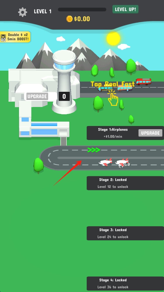 2、点击跑道上的箭头,操控飞机移动,合理规划飞行路线,增加机场运营收益,点击加速。