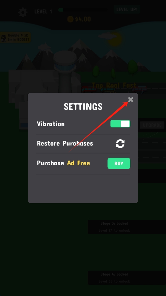 3、进入设置界面,点击叉号,关闭设置,返回游戏主界面,继续机场经营挑战,点击关闭。