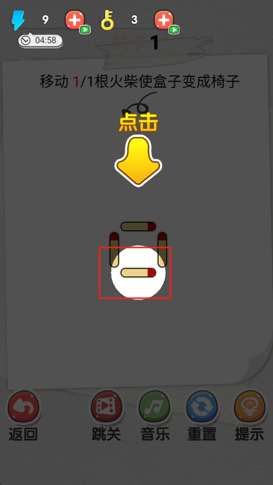 1、首先我们点击图中红色方框内的横向火柴,按住并向上拖动,使其与两侧竖火柴构成椅子的形状。