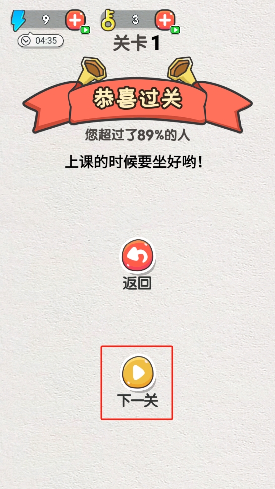 3、成功解开谜题后,关卡背景会亮起通关徽章,点击红色方框内的黄色下一关按钮,进入下一个火柴变形关卡。