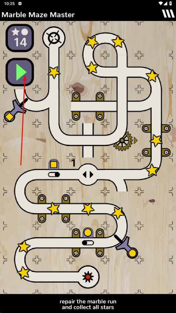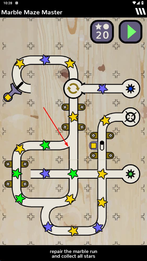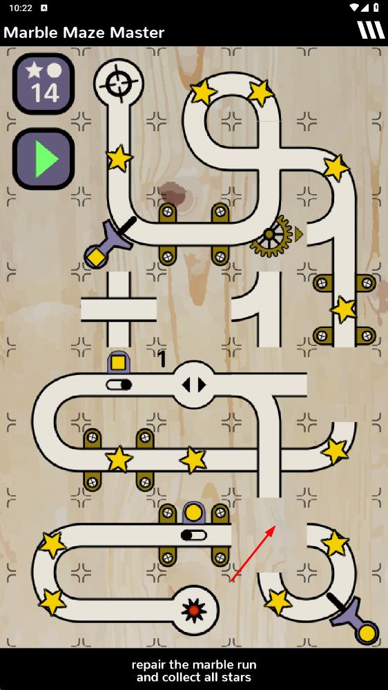 1、进入游戏后,面对由零部件组成的破损弹珠轨道,先观察轨道布局与星星位置,开始拼接轨道,思考好每一轨道的安排为弹珠搭建通往终点的路径。