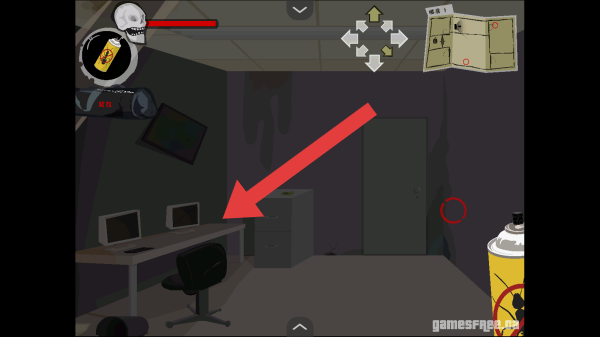 3、展示了一个室内场景,有摆放着电脑的桌子、椅子、柜子,画面右侧有一个喷雾罐的物品,上方有方向操作键、地图标识等。