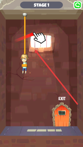 2、在STAGE-1关卡,根据箭头指示在绳索对应位置,滑动屏幕切断绳索使角色利用惯性向出口方向移动。