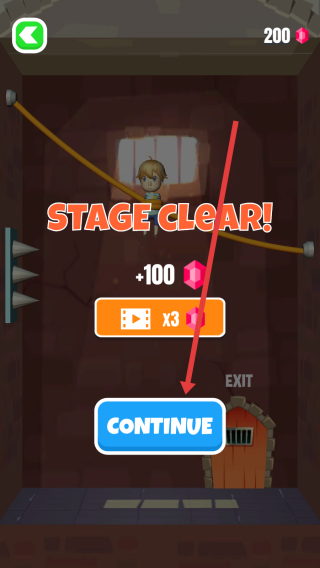 3、成功通关后,可以通过点击CONTINUE按钮,领取100钻石奖励后,继续挑战后续关卡。