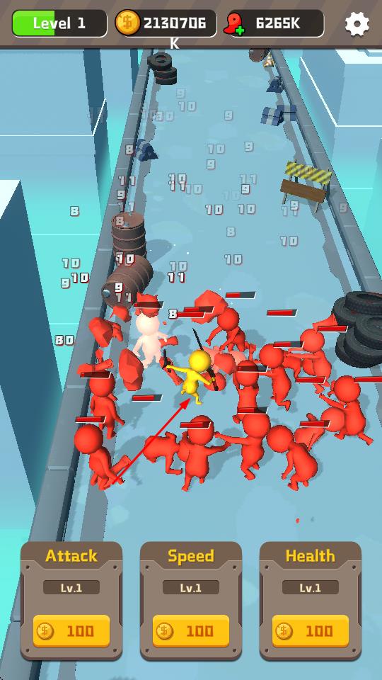 3、在后续关卡中,红色小人的数量和实力会增加,赛道上的障碍物也会变得更加复杂,继续利用属性升级功能,提升角色的攻击、速度和生命值。
