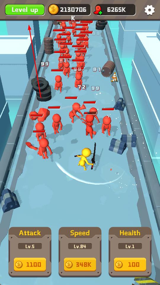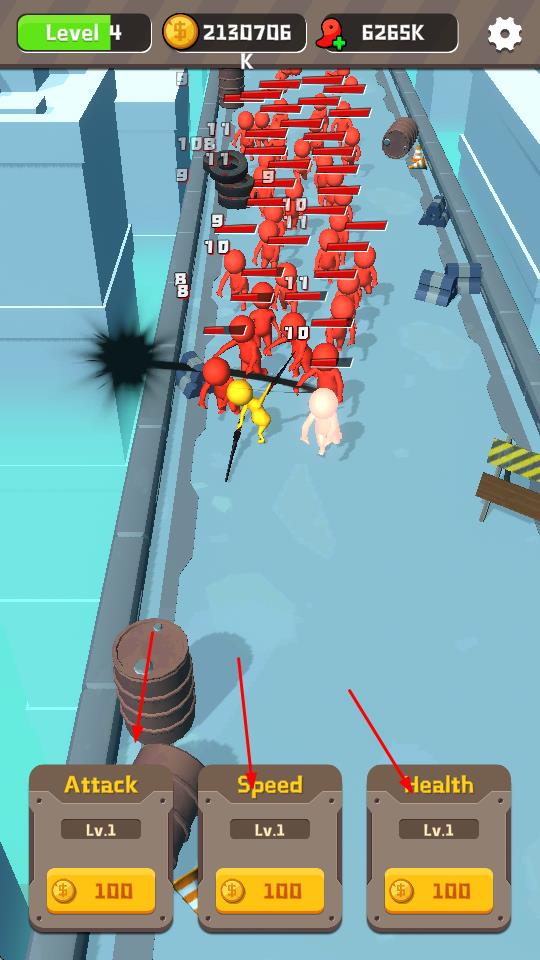 1、进入游戏后,操控黄色小人在赛道上与大量红色小人进行战斗,利用屏幕下方的属性升级按钮,如攻击、速度、生命值,消耗金币升级角色属性。