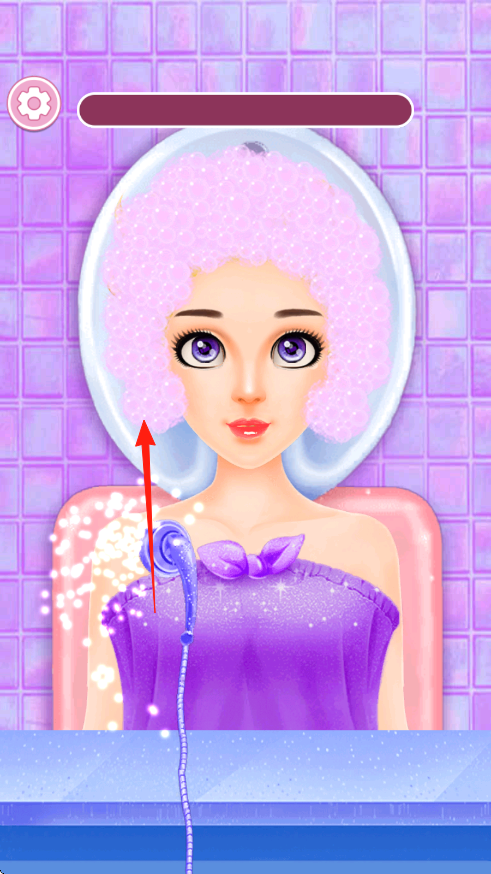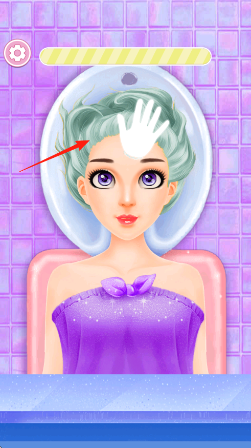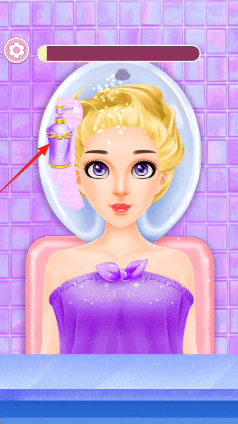 1、进入游戏界面显示角色准备就绪洗头,有洗发水,根据红色箭头指示把洗发水涂抹在头发上。