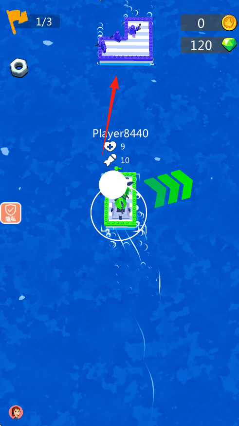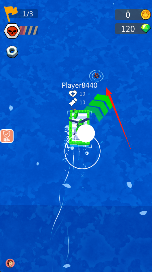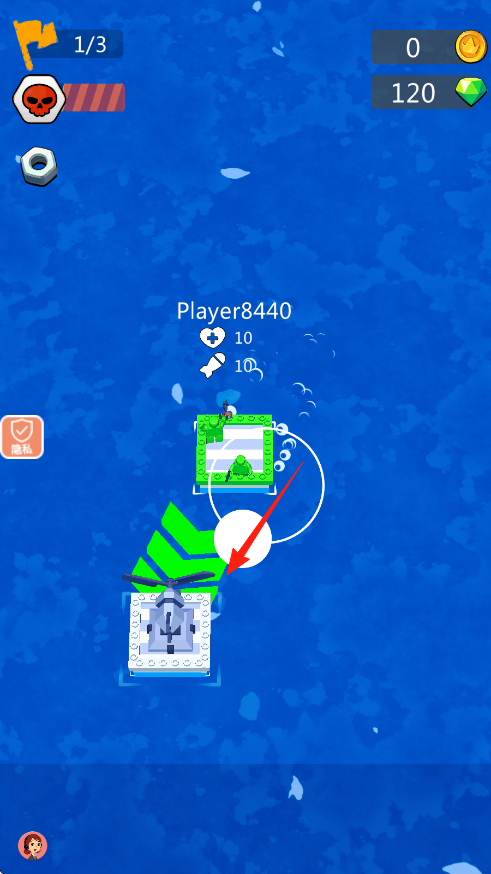 1、玩家标识Player8440,有血量爱心、弹药(炸弹数值,金币、钻石资源,还有隐私按钮、进度标识1/3。