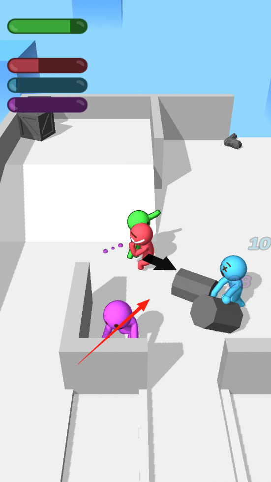 2、闯关策略:协作关卡中,优先分工明确,避免多人无序操作,对抗关卡中,先观察对手位置,利用场景陷阱如弹簧板、坑洞引诱对手靠近,再趁机将其扔出,提升胜率。