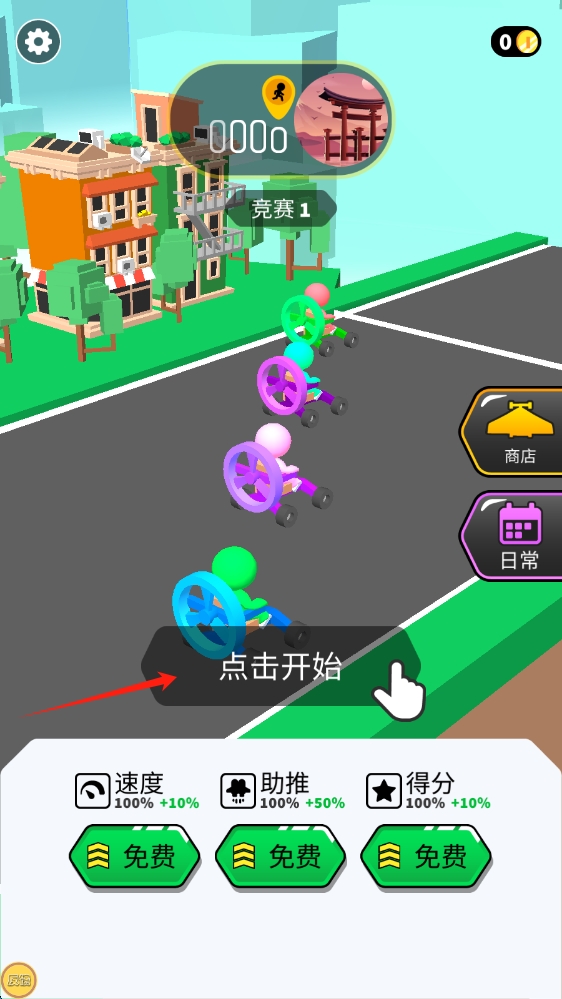 1、在游戏竞赛启动界面,点击点击开始,开启竞速冒险,进入游戏世界,点击按钮开始游戏。
