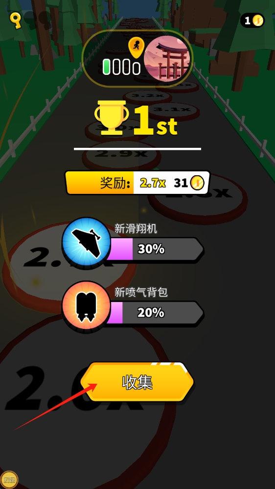 3、关卡成功界面,点击收集,获取奖励,提升角色能力,为后续竞速任务做好准备,点击收集。