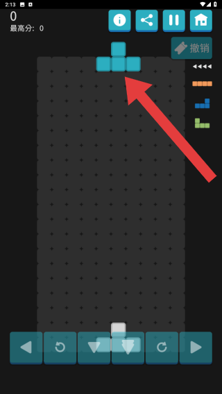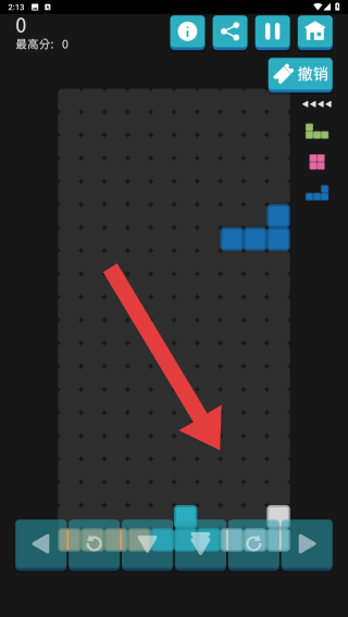 3、画面上方显示最高分0,下方是控制方块移动、旋转、快速下落的操作按钮,区域内有蓝色方块正在下落或已放置。