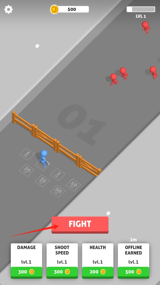 1、在游戏第一关启动界面,点击FIGHT,开启射击战斗冒险,进入游戏世界,点击开始战斗。