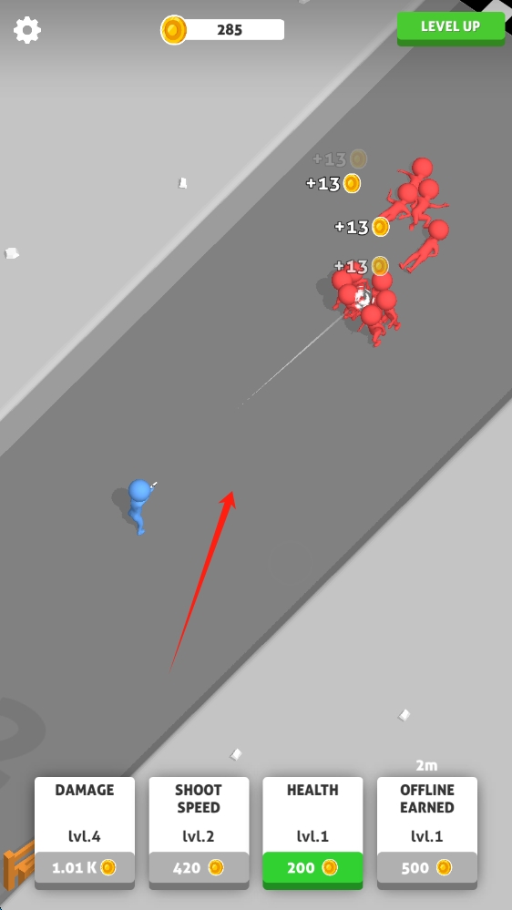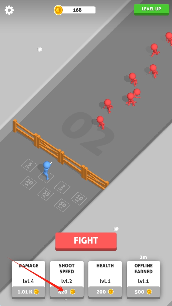 2、进入第二关启动界面,跟随箭头提示,提升射击速度,增强战斗能力,点击升级。