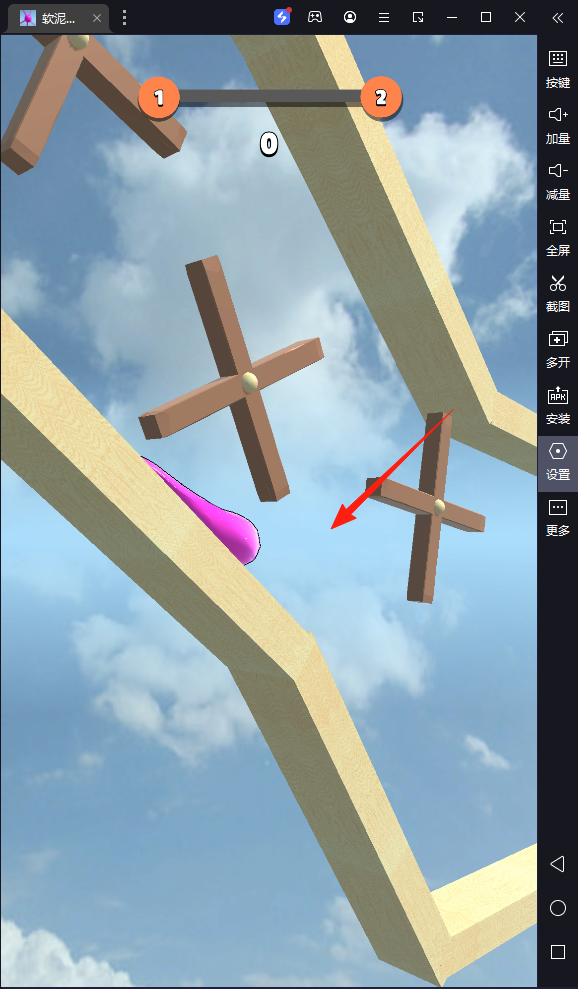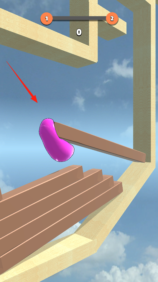 3、软泥继续移动,遇到倾斜木板与阶梯障碍,滑动屏幕,调整软泥移动方向与力度,让软泥借助木板斜坡,越过阶梯,体验利用地形闯关的机制。